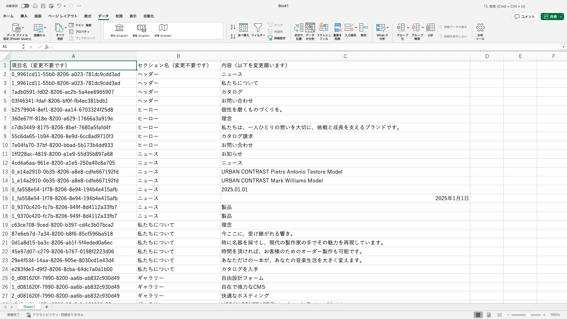 文言はシートでまとめて管理・更新できます。CSV形式で入力できるため、クライアント側も扱いやすく、やり取りがスムーズです。AIの仮テキストをベースに、必要な箇所だけ調整する進め方が有効です。