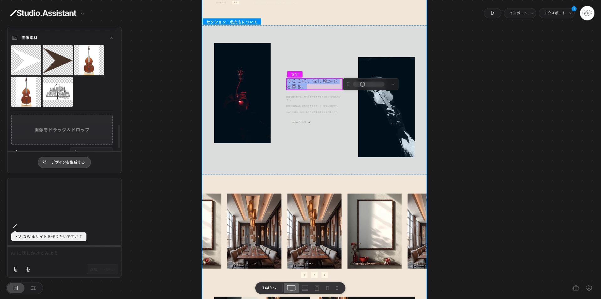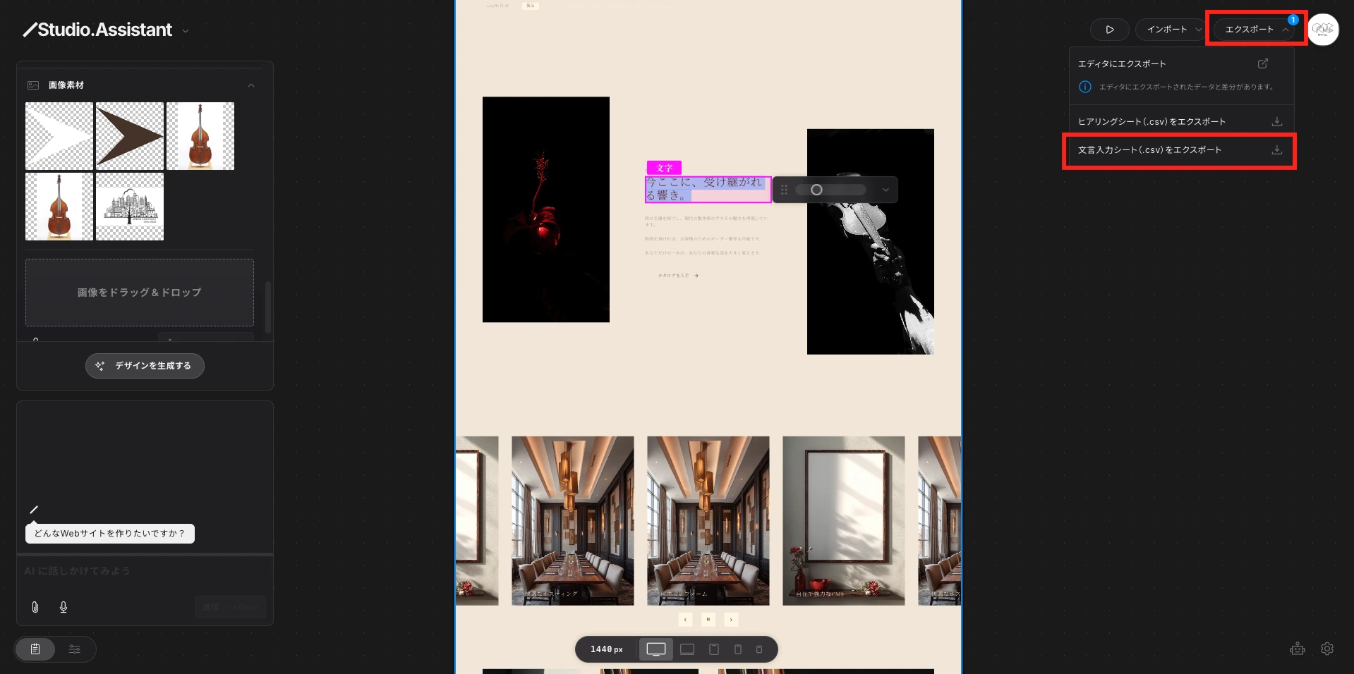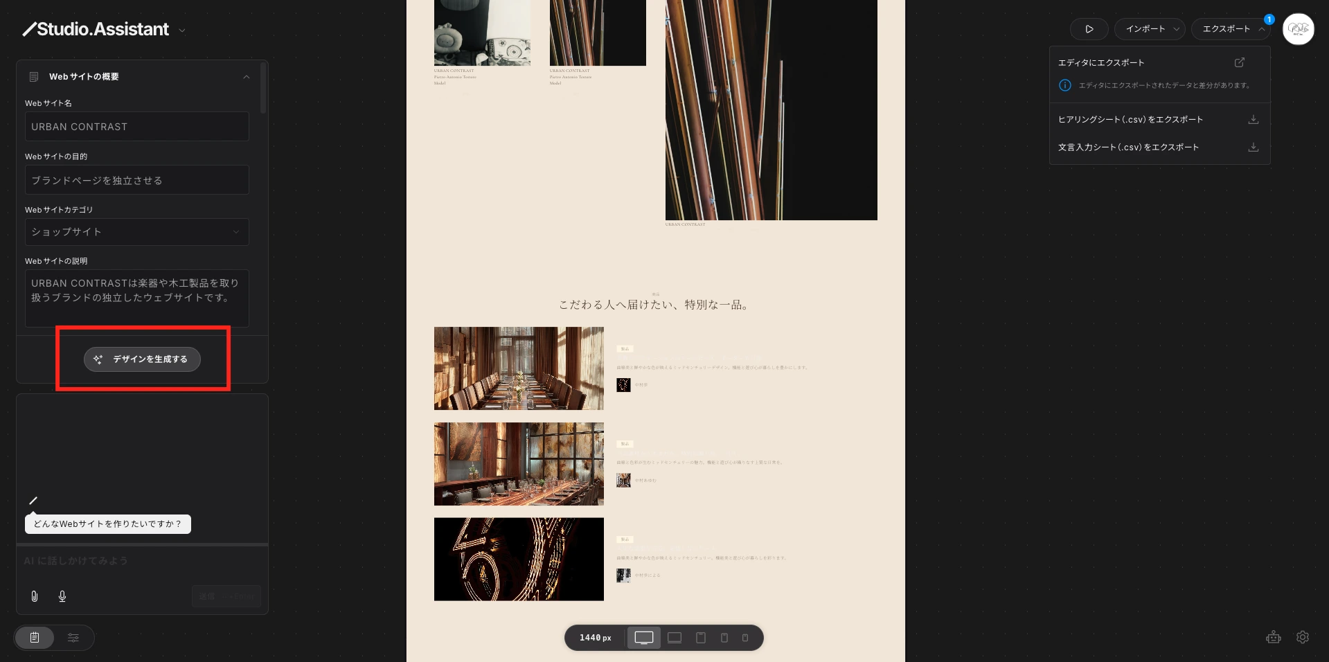 Studio Assistant(Beta)は、Studioが2025年12月にリリースした、Webサイト制作の初期工程を一気通貫で自動化するAI搭載ツールです。
